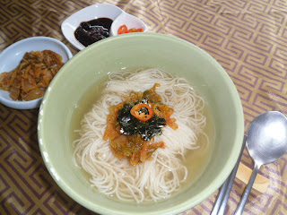 My family expect noodles for lunch in weekends. I make this noodle soup when we want something very fresh and plain or when it is cold. It is called 'janchi-gooksu' in Korean, which means noodles eating at weddings. In the old days Korean people used to serve this noodle dish for the guests wishing the couple stick together for a long time just like noodles.